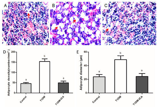 Bone marrow adipocyte and their density and diameter in all experimental groups. (A) The tiba bone marrow of control rat; (B) the tiba bone marrow of T1DM rat; (C) the tiba bone marrow of T1DM-ICA rat; hematoxylin and eosin staining, magnification: 400×; (D) adipocyte density of tibia bone marrow in each group; (E) mean adipocyte diameter of tibia bone marrow in each group. Values are presented as means ± SD. Different letters indicate statistically significant difference (p < 0.05). Red arrows point to adipocytes.
