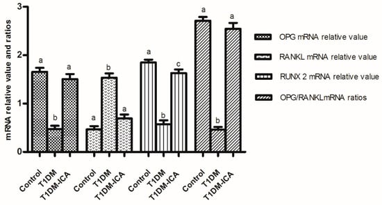 As shown in Figure 7, compared with the control group, the RUNX 2 and OPG mRNA were decreased, RANKL mRNA was increased, and the ratio of OPG/RANKL mRNA was decreased in the T1DM group (p < 0.01); after 8 weeks of ICA administration the RUNX 2 and OPG mRNA were increased, RANKL mRNA was decreased, and the ratio of OPG/RANKL mRNA was increased in T1DM-ICA group compared with T1DM group (p < 0.01).