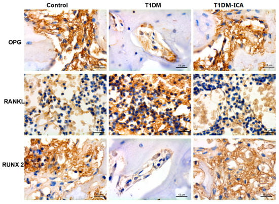 As shown in Figure 8, compared with the control group, OPG and RUNX2 expression were decreased and RANKL expression was increased in T1DM group. 8 weeks of ICA administration effectively increased bone OPG and RUNX 2 expression in T1DM rats, and decreased bone RANKL expression. As shown in Figure 9, there were significant differences of the positive staining area of OPG, RUNX 2, and RANKL between T1DM-ICA and T1DM group (p < 0.05), indicating that ICA supplementation could effectively reduce RANKL and increase the levels of OPG and RUNX 2 in the bone tissue of diabetic rats.