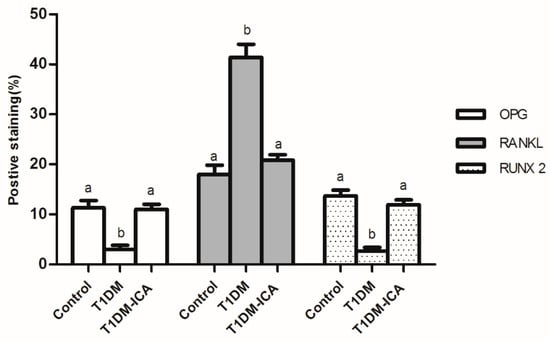 Percentage (%) of the positive staining area of OPG, RANKL, and RUNX 2 in the femoral bone tissues of each group. Values are presented as means ± SD. Different letters (a and b) indicate statistically significant difference (p < 0.05).