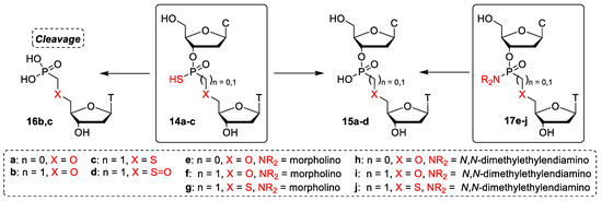 It was reported that the periodate anion partially desulfurized the phosphorothioate TpT dimer [22]. In agreement with this, the treatment of phosphorothioate d(CT) dimer 14a with sodium periodate quantitatively afforded the product of desulfurization, d(CT) phosphate dimer 15a, after 12 h. In case of phosphonothioate dimer 14b, complete cleavage of the internucleotide linkage to phosphonate 16b was observed. On the other hand, S-methylthiophosphonate dimer 14c was cleaved to phosphonate 16c only partially (53%). The rest of the dimer underwent desulfurization and oxidation of S-methylphosphonate linkage to S(=O)-methylphosphonate 15d (47%).