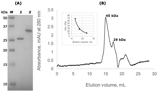To test the ability of Lst-HDD to form dimers in the solution, we performed size exclusion chromatography (SEC) (Figure 2). SEC demonstrated that 75 ± 2.2% of the protein eluted in the volume corresponding to the relative molecular mass of 45 kDa, 18 ± 2.5% eluted in the 29 kDa region and a small portion of impurities eluted as ~16 kDa. The first two peaks likely correspond to the dimeric and monomeric species of Lst-HDD, respectively. Although their calculated molecular masses are ~70 and ~35 kDa, the difference can probably be attributed to the supposedly elongated shape of Lst-HDD causing it to elute faster than globular proteins of respective molecular weight. Thus, Lst-HDD was indeed able to dimerize, although not all molecules formed dimers. However, the mobile phase in the size exclusion chromatography experiments contained 0.5 M NaCl. The high concentration of salt weakens electrostatic interactions. Since electrostatic interactions play a significant role in the dimerization of the selected dimerization domain [33], a higher proportion of dimerized Lst-HDD molecules are expected under low-salt conditions. Alternatively, the reason for incomplete dimerization of Lst-HDD could be the improper folding of a part of the molecules.