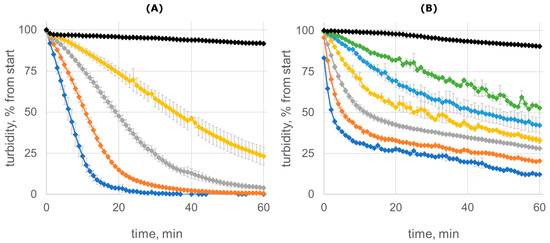 Clearing of S. aureus ATCC 29,213 cell suspension due to different concentrations of lysostaphin (A) or Lst-HDD (B). Lysostaphin concentrations are 2 µg/mL (blue), 1 µg/mL (orange), 0.5 µg/mL (grey), 0.25 µg/mL (yellow), and control without lysostaphin (black); Lst-HDD concentrations are 12 µg/mL (blue), 6 µg/mL (orange), 3 µg/mL (grey), 1.5 µg/mL (yellow), 0.75 µg/mL (light blue), 0.38 µg/mL (green), and control without Lst-HDD (black). The mean values of n = 3 (lysostaphin) or n = 2 (Lst-HDD) experiments are shown, error bars represent standard deviation.