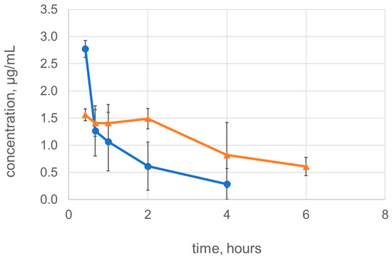 Residual concentrations of lysostaphin (blue, circles) and Lst-HDD (orange, triangles) in rat plasma. The mean values over n = 4 rats are shown, error bars represent standard deviation.
