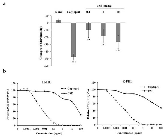 Effects of CSE on blood pressure and ACE activity. (a) Anti-hypertensive effects of CSE in rats. SHRs were orally given with 10 mg/mL captopril or various dosages of CSE. Tail SBP was measured at 0 and 1 h. Data are expressed as changes in SBP (mmHg). Values are mean ± standard error (n = 6). ** p < 0.01, *** p < 0.001, compared with blank. (b) ACE activity assay. Various amounts of captopril or CSE were mixed with serum ACE and substrates (H-HL or Z-FHL). The hydrolyzed substrates were then labeled with fluorescence and measured using a fluorometer. Data are expressed as relative ACE activity (%), which is presented as the comparison with the fluorescence relative to blank. Values are mean ± standard error (n = 6).