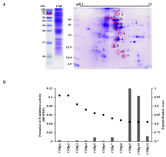 Analysis of potential bioactive peptides in CSE. (a) Protein profiles of CSE. Proteins in CSE were separated by SDS-PAGE (left) and 2-DE (right) on 15% polyacrylamide gels. Proteins were visualized by Coomassie Brilliant Blue R-250. Protein spots in red circles were further analyzed by LC-MS/MS. Protein size markers (in kDa) are shown at the left. Photographs are representative images of three independent experiments. (b) Prediction of potential bioactive peptides using PeptideRanker and BIOPEP. Dots represent PeptideRanker scores. Bars represent potential ACE inhibitor activity analyzed by BIOPEP.
