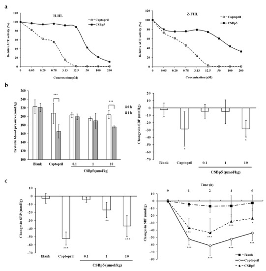 As shown in Figure 3a, captopril inhibited the hydrolysis of both H-HL and Z-FHL substrates by ACE in a dose-dependent manner. The IC50 values of captopril were 0.68 ± 0.09 µM (H-HL substrate) and 1.08 ± 0.09 µM (Z-FHL substrate). CSBp5 also inhibited the ACE activity and the inhibition displayed a dose-dependent manner. The IC50 value of CSBp5 for the hydrolysis of H-HL by ACE was 44.11 ± 1.04 μM, while IC50 value for the hydrolysis of Z-FHL was 81.71 ± 1.06 μM. Moreover, our findings suggested that CSBp5 exhibited a more effective inhibition on the C-domain of ACE. Anti-hypertensive effects of CSBp5 were further evaluated by administering (intraperitoneally) various amounts of CSBp5 in SHR. Tail SBP was measured 1 h after injection. As shown in Figure 3b, a slight decrease of SBP was observed 1 h later in blank group, while a significant decrease (52.83±19.06 mmHg) was observed in captopril group. Intraperitoneal injection of CSBp5 decreased SBP levels in a dose-dependent manner. A significant decrease (28.33 ± 12.5 mmHg injection) was observed in 10 μmol/kg CSBp5 group. Oral administration of CSBp5 also decreased the SBP levels in a dose-dependent manner and a significant decrease (36.78 ± 13.25 mmHg) was observed in 10 μmol/kg CSBp5 group (Figure 3c). Time-course effect of anti-hypertensive ability of CSBp5 was further evaluated in SHR. SHRs were orally given with 10 μmol/kg captopril or CSBp5, and the tail SBP was measured at 0, 1, 2, 4, and 6 h. As shown in Figure 3c, oral administration of water (blank) did not affect SBP levels. However, administration of captopril and CSBp5 caused a significant decrease in SBP, with SBP falling by approximately 60 mmHg and 30 mmHg, respectively, at 2 h. Moreover, the decrease SBP level by CSBp5 was persistent during a 6-h measurement. The changes in diastolic blood pressures were also consistent with the changes in SBP (Supplementary Materials Figure S1). Therefore, these data suggested that CSBp5 inhibited ACE activity and decreased SBP levels in rats.