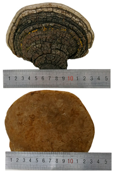 Phellinus linteus (Berkeley & M. A. Curtis) Teng is a famous oriental medicinal mushroom, which belongs to Phellinus Quel., Hymenochaetaceae, Aphyllophorales, Hymenomycetes, and Basidiomycetes, and is more commonly known as “sanghuang” in China, “meshimakobu” in Japan, and “sangwhang” in Korea. Its basidiocarps are perennial, pileate, sessile, and usually horseshoe shaped. The pileal surface is dark brown when fresh and becomes black when dried, the pore surface is rusty brown when fresh and becomes brown when dried, the context is brown, and the upper context is a black carapace, and its tubes are cinnamon yellowish-brown when dried (Figure 1). P. linteus is a wood decay fungus that grows on the trunk of Populus Linn., Quercus Linn., Toxicodendron vernicifluum (Stokes) F. A. Barkley, and Morus alba Linn., and the best time for harvesting is from April to May. As a famous mushroom, P. linteus is mainly derived from tropical America, Africa, and East Asia, and it is particularly abundant in China, Japan, and Korea. Additionally, it has been recognized as beneficial to health and an ancient medicine for more than 2000 years [1]. P. linteus was first recorded in Shen Nong’s Herbal Classic (Shen Nong Ben Cao Jing), a famous Chinese medical book during the Han dynasty [2]. It has also appeared in many other Chinese medical books, including the New Compendium of Materia Medica (Xin Xiu Ben Cao) and Compendium of Materia Medica (Ben Cao Gang Mu) [3,4]. According to traditional Chinese medicine (TCM) theory, it was believed that P. linteus could be used to alleviate sickness in humans by consolidating a channel for hemostasis, removing blood-arthralgia consumption, relieving abdominal pain, and treating chronic diarrhea, among other benefits [5].