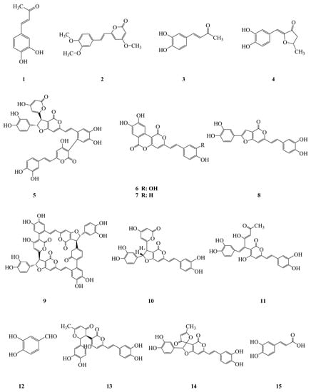 Phenylpropanoids are the most representative and predominant type of bioactive constituent in the fruiting body and the mycelium of P. linteus with verified anti-inflammatory [12], antioxidative [24], antitumor [53,55,56,57], antidiabetic [59,61,62,65,66,67], antimicrobial [28], antiviral [33], and anti-complementary activity [80], as well as cardioprotective [78] and gastroprotective [79] effects. Among them, 3,4-dihydroxybenzalacetone (1) from the fruiting body of P. linteus was reported to show anti-inflammatory activity [12]. It was reported that 3, 4-dihydroxybenzalacetone (1), hispidin (2), meshimakobnol A (6), meshimakobnol B (7), and phellifuropyranone A (8) showed antitumor effects in vitro and in vivo [53,55,56,57]. Some previous studies have indicated that hispidin (2), inotilone (3), 4-(3,4-dihydroxyphenyl)-3-buten-2-one (4), and caffeic acid (15) from the mycelium of P. linteus exhibited antioxidative activities [23,24]. Some articles have also shown that inotilone (3) and 4-(3,4-dihydroxyphenyl)-3-buten-2-one (4) have antiviral activities [33]. Recent studies have revealed that hispidin (2), phelligridimer A (9), hypholomine B (10), interfungin A (11), protocatechualdehyde (12), davallialactone (13), and inoscavin A (14) from the fruiting body of P. linteus all showed antidiabetic effects [59,61,62,65,66,67]. It was reported that phellinstatin (5) displayed antibacterial activity against Staphylococcus aureus and MRSA (Methicillin resistant S. aureus) [28]. In addition, hispidin (2) was reported to have a cardioprotective effect [78]. Furthermore, 4-(3,4-dihydroxyphenyl)-3-buten-2-one (4) was reported to exhibit gastric protective activity [79]. To date, 15 kinds of phenylpropanoid compounds have been isolated from P. linteus with biological activities and pharmacological applications.