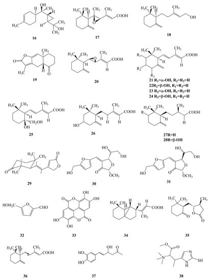Terpenoids are also the major bioactive constituents of the mycelium of P. linteus and are important secondary metabolites. To date, phytochemists have discovered 13 kinds of terpenoids from the mycelium of P. linteus with pharmacological activity [29,30,40,69]. It was reported that phellilane L (16), phellidene E (17), and (−)-trans-γ-monocyclofarnesol (18) exhibited antimicrobial activities against P. gingivalis [29,30]. In addition, atractylenolide I (19) was revealed to have antitumor activity [40]. Furthermore, phellinulin D (20), phellinulin E (21), phellinulin F (22), phellinulin G (23), phellinulin H (24), phellinulin I (25), phellinulin K (26), phellinulin M (27), and phellinulin N (28) isolated from the mycelium of P. linteus were indicated to have a hepatoprotective effect [69]. Furthermore, the chemical structure of terpenoid components is clearly correlated with pharmaceutical activities, and this relationship will be the subject of increasing research attention in the future.