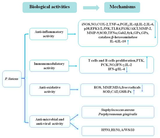 The biological activities of P. linteus and their mechanisms.