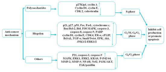 The polysaccharides of P. linteus have shown anticancer activities both in vitro and in vivo. One study found that polysaccharides (100, 200 mg/kg/d) of P. linteus treated for 30 days significantly inhibited tumor growth in a human colorectal carcinoma cell (HT29)-bearing mouse model in vivo compared with saline (0.2 mL/d) as a negative control and cisplatin (2 mg/kg/d) as a positive control [34]. Compared with the untreated control, polysaccharides (25, 50, 100, 200 μg/mL) from the fresh fruiting body of P. linteus treated for 1.5 to 48 h significantly inhibited the proliferation of HT29 by blocking the cell cycle in S-phase and downregulating the expression of cyclin D1, cyclin E, and cyclin-dependent kinases (CDK2) with increased upregulation of P27kip1 expression in a dose-dependent manner but with no contribution to apoptosis and autophagy [34]. Some other studies have also shown that polysaccharides (50, 100, 200 μg/mL) from the fresh fruiting body of P. linteus treated for 24, 48, and 72 h caused significant inhibition of HepG2 cell proliferation in a dose-dependent manner (48 h, IC50 = 125 μg/mL). Furthermore, administration of 100 and 200 mg/kg of P. linteus polysaccharide for 18 days showed a significant inhibitory effect on tumor growth in vivo compared with the tumor-bearing (TB) control mice. The results have generally indicated that polysaccharides of P. linteus exhibit significant antitumor activity against HepG2 through blocking tumor cells going into the S stage, upregulating the expression of P27kip1 and cyclin A, and downregulating the expression of calreticulin, cyclin D1, cyclin E, and CDK2 in vitro and in vivo, but there is an urgent need to verify whether there is a relationship between this remarkable decrease in CDK2 and induced S-phase arrest [35]. Pei et al. (2013) revealed a novel high molecular weight polysaccharide (PL-N1) (50, 100, 200 μg/mL) from the mycelium of P. linteus composed of arabinose, xylose, glucose, and galactose, and the backbone of PL-N1 was (1→4)-linked β-D-xylopyranosyl residues; it could inhibit the growth of HepG2 cells in a dose-dependent manner in vitro [36]. Mei et al. (2015) found two novel high molecular weight polysaccharides—PLPS-1 with a backbone of α-D-α-Glc (1→4)-α-D-Glc (1→6) units and PLPS-2 with the backbone of α-(1→3)-D-Glc and α-(1→6)-D-Glc. The study indicated that PLPS-1 (25, 50, 100, 200 μg/mL), but not PLPS-2, from the mycelium of P. linteus exhibited strong anticancer activity against S-180 sarcoma cells by induction of apoptosis, where 5-fluorouracil (5-Fu) (25 μg/mL) was used as a positive control [37]. Protein–protein interaction (PPI) analysis has indicated that the DJ-1 and the 14-3-3 proteins play important roles in polysaccharide-treated HepG2 cells with β-actin as a positive control, but whether these proteins can be used for markers of hepatocellular carcinoma (HCC) needs further investigation [38]. The present study showed that the polysaccharides (50 μg/mL) of P. linteus could reduce the side effects of camptothecin 11 (CPT 11) (10 ng/ml) when they were used as a drug combination in colon cancer HCT116 and HT29 cells [39]. It was reported that ethanol extracts, n-hexane fractions, and ethyl acetate fractions of P. linteus mycelia inhibited the growth of the HT29 cell line in a dose-dependent manner, and the IC50 values were 149.9, 69.8, and 77.8 µg/mL, respectively [40]. According to these studies, polysaccharides of P. linteus played an important role in producing the observed anticancer activities.