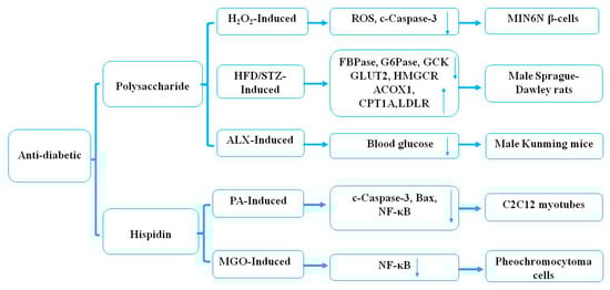Some previous studies have indicated that natural health products have potential antidiabetic effects [86]. Kim et al. [58] demonstrated that polysaccharides (30 mg/kg) of P. linteus, as examined every other day from eight to 24 weeks, markedly increased Th2 cytokine production and decreased Th1 cytokine production in a Streptozotocin-induced diabetic animal model. In addition, polysaccharides from the mycelium of P. linteus inhibited autoimmune diabetes through reducing the expression of cytokines, including IFN-γ, IL-2, and TNF-α in Th1 cells and macrophages in vitro [58]. One study confirmed that treatment with hispidin (70 μM) from the mycelium of P. linteus could not only exhibit potent-free radical-scavenging effects but could also protect MIN6N β-cells from ROS toxicity through inhibiting cell apoptosis and caspase-3 activity induced by hydrogen peroxide in diabetes [59]. Oral administration with polysaccharides from the mycelium of P. linteus at 100 mg/kg body weight/d could markedly decrease the level of blood glucose by 35.60% in alloxan (ALX)-induced diabetic mice [60]. The mechanism of the hypoglycemic effect may be related to the chemical structure of the polysaccharides and needs further study. Another study showed that hispidin (1–100 μM) from the mycelium of P. linteus treated for 8 h could exhibit a cytoprotective effect through reducing the expression of Bax, ROS, and NF-κB in palmitate (PA)-induced oxidative stress in C2C12 myotubes, and that it had therapeutic potential as an antidiabetic drug [61]. In vitro studies have indicated that ergothioneine (2 μM) and hispidin (2 μM) from the mycelium of P. linteus had hypoglycemic effects by inhibiting the expression of the NF-κB signaling pathway through antioxidative activities in rat pheochromocytoma cells compared with positive controls [epalrestat (EPA), 10 μM; aminoguanidine (AMG), 100 nM] [62]. Recent studies have demonstrated the underlying molecular mechanisms of polysaccharides of P. linteus in the treatment of diabetes mellitus [63]. Polysaccharides (50 mg/kg) of P. linteus examined twice a day for four weeks significantly decreased blood glucose and improved glucose intolerance in male C57BL/6J mice compared with blank and high-fat high-fructose diet (HFD) control groups. In addition, polysaccharides of P. linteus ameliorated insulin resistance through regulating hepatic phospholipid metabolism and stimulating insulin signaling transduction [63]. It was reported that polysaccharides (300, 600 mg/kg) from the mycelium of P. linteus treated for eight weeks efficiently decreased the blood glucose level and increased insulin resistance and glycogen in an HFD-induced (120 mg/kg) storage and low-dose streptozotocin (STZ) (45 mg/kg)-induced type 2 diabetic rat model [64]. The above research results have shown that polysaccharides from the fruiting body of P. linteus have a better application potential in the adjuvant therapy of type 2 diabetes. It was reported that phelligridimer A, protocatechualdehyde, davallialactone, hypholomine B, interfungin A, and inoscavin A isolated from the fruiting body of P. linteus possessed significant rat lens aldose reductase and human recombinant aldose reductase inhibitory activity in vitro, with IC50 values of 0.63, 4.26, 20.52, 0.33, 0.82, 1.03, and 1.06 μM and 1.37, 7.93, 35.36, 0.56, 1.28, 1.82, and 1.40 μM, respectively [65]. Protocatechualdehyde, davallialactone, and inoscavin A isolated from the fruiting body of P. linteus showed a significant inhibitory effect on methylglyoxal-medicated protein modification with IC50 values of 144.28, 213.15, and 158.66 μM, respectively [66]. Protocatechualdehyde and 5-hydroxymethyl-2-furaldehyde isolated from the fruiting body of P. linteus had an inhibitory effect on the oxidation of catalytic L-tyrosine with an IC50 value of 0.40 and 90.8 mg/mL, respectively [67]. These findings demonstrated that protocatechualdehyde, davallialactone, hypholomine B, interfungin A, inoscavin A, and 5-hydroxymethyl-2-furaldehyde all had a potential therapeutic effect on diabetes [65,66,67]. The potential mechanism underlying the antidiabetic effects of P. linteus is presented in Figure 5.