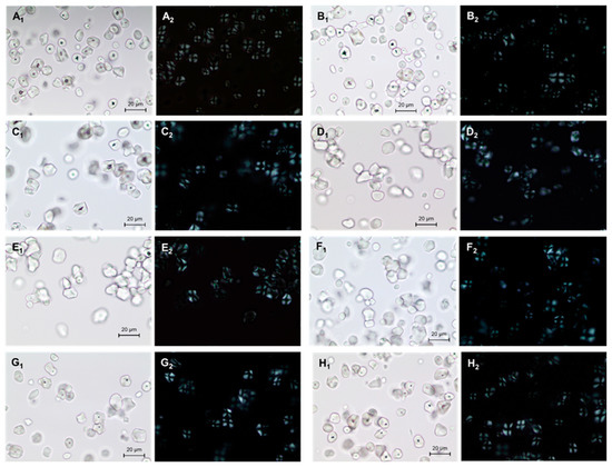 Increased temperature did not affect the shape or size of the native corn granules. Starch granules treated with 2.0 M malic acid were not destroyed [18]. Corn starch granules did not vary significantly in size with pH value of solution and maintained cohesion. Granule shape of malic acid-treated starch was not destroyed by any concentration of malic acid. The Maltese cross was observed; in addition to the semi-crystalline structure and radially ordered alignment of amylose and amylopectin [19]. The Maltese cross was clearly observable in all starch samples, indicating that the internal structure of the starch remained regularly arranged with changing pH value (Figure 1A2–H2). Thus, the shape and structure of starch granules did not change in response to heat or malic acid.