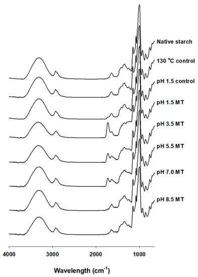 Fourier-transform infrared spectroscopy (FT-IR) was used to evaluate the structural characteristics of the functional groups in the starches. Peaks in the range of 3,000–3,500 cm−1 represent the presence of hydroxyl groups (-OH), and the peak at 2,930 cm−1 represent C-H bond stretching [21]. Peaks in the range of 980–1,240 cm−1 may be caused by the stretching vibration of C-O bond [22]. The peak near 1,730 cm−1 is a carbonyl group (C=O) [18,23] and the malic acid-treated corn starches at pH values of 1.5, 3.5, and 5.5 showed the carbonyl peaks at 1,722 cm−1, especially high carbonyl peak intensity at pH 1.5 (Figure 2). None of the samples demonstrated a carbonyl peak at pH 7.0 or pH 8.5. This is due to the destruction of intermolecular hydrogen bonds at lower pH values, indicating a bridge formation by ester bond between starch and malic acid. As the peak intensity of malic acid-treated starch samples increased, the contents of RS also increased (p < 0.05). The RS content was: 87.9% for pH 1.5 MT, 51.9% for pH 2.5 MT, and 46.4%, for pH 5.5 MT. Thus, the condition of high pH caused hydrolysis of the bridge bonds in malic acid-treated corn starches [18].