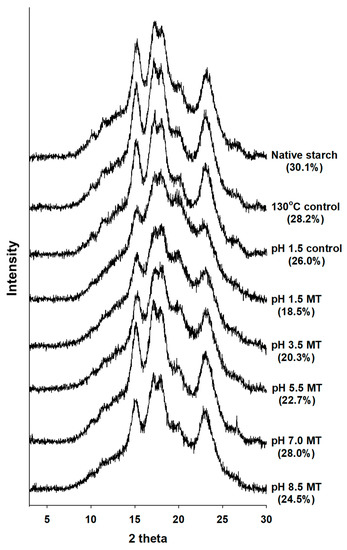 X-ray diffraction patterns and relative crystallinity of native and malic acid-treated corn starches. Numbers in parentheses indicate the percentage of crystallinity. MT, malic acid treatment.