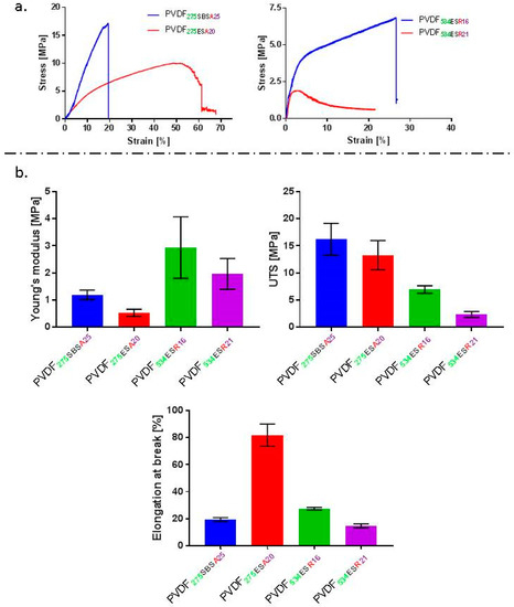 Tensile testing revealed PVDF275SBSA25 fibre mats to have higher tensile strength (16.2 MPa) and Young’s modulus (1.2 MPa) in comparison to PVDF275ESA20 fibre mats (13.3 MPa and 0.5 MPa respectively) (Figure 2b). Fibrous membranes obtained in this study had higher tensile strength and lower Young’s modulus than those previously reported for ES PVDF fibres [33]. Direct comparison is however difficult as fibre mat mechanical properties can be affected by the composition of solvent and the molecular weight of PVDF being utilised to spin fibres [33,43,44]. Furth to this, inter fibre pore size, mat/membrane porosity and fibre diameter influence mechanical properties [45,46]. The elongation at break% was found to be higher for PVDF275ESA20 fibres, i.e., circa 80% strain at break compared to 20% for the solution blow spun fibres. A contrary trend in failure behaviour was observed by Bolbasov et al. in their study of mechanical properties of nonwoven SBS and ES membranes of PVDF-co-TrFE [47]. The uniaxial tensile strength of non-woven fabrics in their study was higher for ES scaffolds [47]. This discrepancy could arise from a difference in alignment of fibres and the composition of the polymer used. PVDF is known to be a chemically resistant and hydrophobic polymer, the mechanical properties of which are not susceptible to changes in hydration, provided that any solvents used in processing have been sufficiently removed [32,48]. The results from tensile testing are summarised in Figure 2.