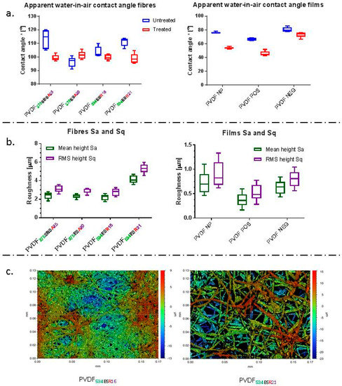 (a) Apparent water-in-air contact angle values obtained for untreated and treated (pre-conditioned with cell culture media and dried) fibre mats and films, * represents apparent water-in-air contact angle (b) Distribution of roughness parameters obtained for fibrous PVDF membranes and PVDF films. (c) Representative optical profilometry images obtained for different samples.
