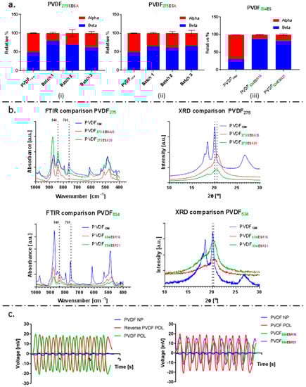 Following physical and morphological characterisation of the materials, the emphasis was shifted to test the reproducibility of the fibre membranes and their piezoelectric characteristics. FTIR revealed the characteristic peaks of β-phase (840 cm-1) and no prominent peaks for γ-phase (833 cm−1 and 1233 cm−1) for both types of fibres fabricated [65,66], as shown in Figure 4b. X-RD results further confirm the presence of β-phase in the fibre membranes. Quantification of the electroactive β-phase yielded a higher value for SBS fibre mats when compared to those of electrospun fibres, and found similar to that of commercially obtained PVDF piezoelectric films (PVDF POL) (SBS ~76% (PVDF275SBSA25); ES ~67% (PVDF275ESA20), and ~75% for PVDF POL). FTIR evaluations obtained are summarised in Figure 4. The higher solution flow rate of 75 μL min−1 and 25% w/v concentration used in SBS results in > 300% higher throughput of PVDF fibres as compared to ES (as summarised in Table 1). However, batch-to-batch comparison of the β-phase content revealed lower variability in the fibres fabricated using ES. SBS fibre mats exhibited a variation in the amount of β-phase of ~15%, compared to ES fibre mats at ~5%. Solvent evaporation rate and environmental temperature during processing are known to influence the content of piezoelectric phase in PVDF-based materials [67,68] and could account for the greater variability observed in SBS fibre mats. PVDF solution temperature, air temperature, pressure, flow, and spinning environment, in addition to polymer molecular weight, influence spinnability [69]. This highlights the importance of controlling the temperature of PVDF solution and spinning environment used to fabricate PVDF fibres and warrants further investigation. The percentage crystallinity of fibres and films was in the range ~40–45%, as determined by differential scanning calorimetry (DSC), summarised in Table 2.