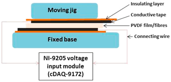 A rig was constructed to record voltage generated from the piezoelectric materials on mechanical deformation, schemed in Figure 5. A cyclic loading regime of 5 N with a frequency of 4 Hz was applied using an Instron 3344 mechanical testing instrument; similar to approaches previously reported to test the piezoelectric characteristics of PVDF fibre mats [21,34]. Contact surfaces were insulated using electrical insulating tape to ensure that the electrical signals generated were collected and measured efficiently. A voltage input module (NI 9205, National Instruments Corporation (U.K.) Ltd.) was used following manufacturer instructions. Porosity measurements (described above) were utilised to obtain the amount of voltage generated by the effective amount of PVDF present (normalised voltage) in the fibre mats. The normalised voltage values were compared to those obtained for PVDF films. Data was collected using LabVIEW software and cyclic voltage response was re-plotted using GraphPad Prism (Version 7.04).
