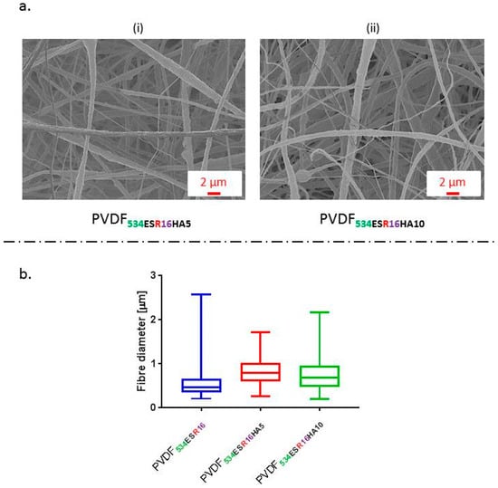 (a) SEM images of composite fibre mats obtained by inclusion 5 wt.% (i) and 10 wt.% (ii) HA in PVDF, (b) fibre diameter distribution of the ES composite fibres in comparison to neat PVDF fibres.