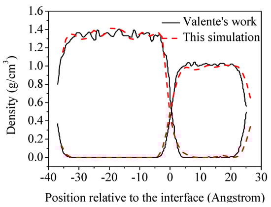 In order to verify the simulation method in our work, we simulate the molecular distributions of an octane–water system as provided by Valente []. The concentration distributions are compared in Figure 2. The agreement of the interfacial distribution profiles of water and octane molecules verifies the rationality of the method used in our work.