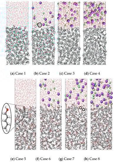 In order to establish an intuitive understanding of the distribution characteristics of various microscopic particles at the oil–water interface, the interfacial microstructures of the fluorobenzene–water system and the pentanol–water system at equilibrium state with different electrolyte ion contents are presented in Figure 3. As shown in Figure 3a–d, fluorobenzene molecules are closely packed in the oil phase in the fluorobenzene–water system due to their planar configuration and small volume. Owing to the attraction of hydrogen bonds of adjacent water molecules, the arrangement of fluorobenzene molecules at the interface is looser than that of fluorobenzene molecules in the oil phase. When sodium ions and chloride ions exist in the aqueous phase, a small amount of fluorobenzene molecules enter the aqueous phase (as shown in Figure 3b) because of the additional ion–fluorobenzene electrostatic interaction. However, with the further increase of electrolyte ions (Na+/Cl−) in the aqueous phase, the density of aqueous phase layer increases, the electrostatic interaction between water molecules and anion and cation increases, thus the binding between water molecules and ions makes it difficult for fluorobenzene molecules to enter the aqueous phase (as shown in Figure 3d).