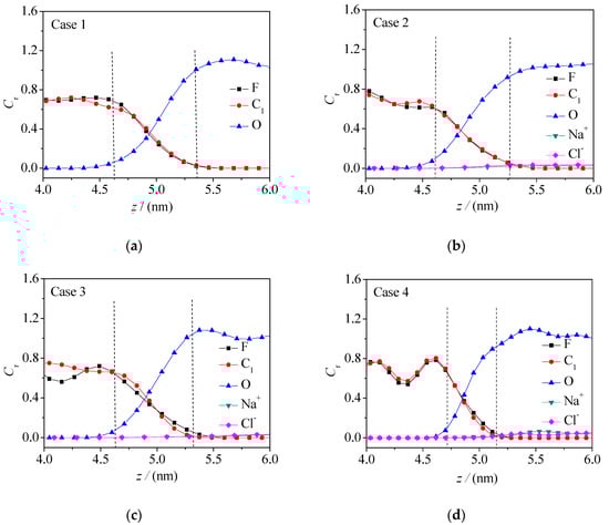 Concentration distribution curve of F, C, O, Na+, and Cl− at the oil–water interface in the fluorobenzene–NaCl aqueous solution system: (a) Case 1; (b) Case 2; (c) Case 3; (d) Case 4.