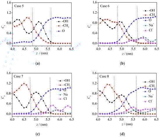 Concentration distribution curve of F, C, O, Na+, and Cl− at the oil–water interface in the 1-pentanol–NaCl aqueous solution system: (a) Case 5; (b) Case 6; (c) Case 7; (d) Case 8.