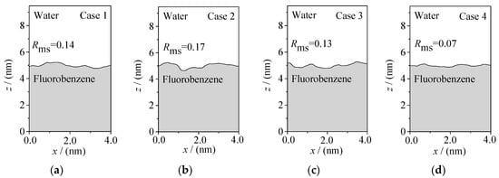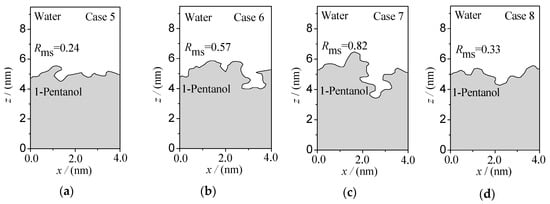 The rough morphology of the oil–water interface is also an important feature of the microscopic distribution of particles at the interface. Therefore, based on the spatial distribution of various particles in the oil–water two-phase systems, the oil–water interface boundary curves are generated by projecting the oil–water two-phase system to the x-y-z plane, as shown in Figure 6 and Figure 7. Here, the root mean square roughness Rms [] is especially defined to quantitatively characterize the roughness of an oil–water interface: