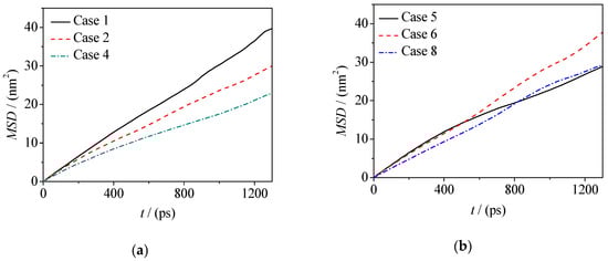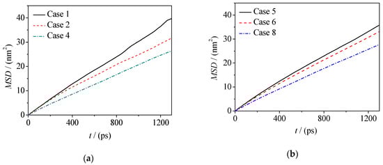 In Formulas (2) and (3), the position coordinates of ri(0) and ri(t) are the position coordinates of the i-th water molecule at the initial time and the current time, respectively, and D is the diffusion coefficient of the water molecule. Accordingly, the corresponding diffusion coefficients are given in Table 2 (Di is the diffusion coefficients of water molecules at the interface and Db is the diffusion coefficients of water molecules in the water phase). From Formulas (2) and (3), it should be noted that for normal diffusion, the MSD-t plots should be linear and then the correct diffusion coefficient D can be obtained according to the hypothesis of Einstein function. Therefore, we extracted the data at the equilibrium stage.
