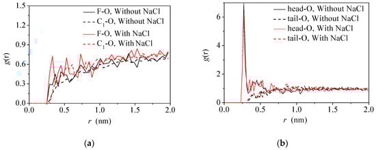 In addition, the abnormal increase of the diffusion ability of water molecules at the pentanol–water interface with the increase of the number of ions in the water phase can be explained by radial distribution function (RDF) analysis. Figure 10a shows the g(r) of the hydrophilic and hydrophobic parts of fluorobenzene molecules around O (water) atoms for the fluorobenzene–water system with (without) Na+/Cl− ions in the water phase. Larger peaks can be observed at ~0.3 nm in the g(r) of the hydrophilic groups and water molecules (F-O), especially for the system with Na+/Cl− ions. This means the addition of NaCl leads to the compression of the interface and densely packing of the molecules. For the pentanol–water system (Figure 10b), more pronounced first peak was presented at the g(r) of hydrophilic part and water molecules (head-O). However, there is no obvious change in the g(r) profiles with and without NaCl in the water phase. It is suggested that the pentanol molecules at the interface orient their hydroxyl group toward the water phase. When adding NaCl in the water phase, some water molecules burst into the space of pentanol and the pentanol molecules retain regular configurations at the interface. Thus, the interfacial packing is not obviously changed.