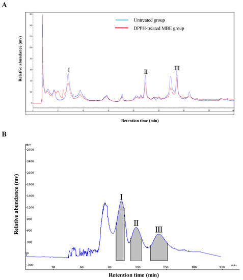 The DPPH–HPLC experiment was carried out according to the previous literature with slight modifications [33]. Briefly, a volume of 200 μL of 5 mg/mL MBE was mixed with DPPH solution (0.2 mM in acetonitrile). After passing through a 0.45-μm syringe filter, the reaction mixtures were analyzed by HPLC in comparison with a blank and control. The mixtures were separated and analyzed by a reversed-phase ZORBAX ODS (150 mm ×4.6 mm i.d., 5 μm, Milford, MA, USA) column. The mobile phase consisted of A (0.4% acetic acid in water) and B (acetonitrile), which was programmed as follows: 0–40 min, 10–25% B. The flow rate was 1 mL/min, while the ambient temperature was controlled at 30 °C, and 254 nm was selected as the detection wavelength.