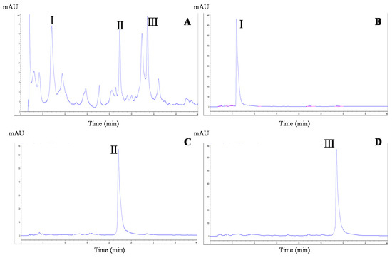 In HSCCC-based separation, the selection of a suitable two-phase solvent system is the most vital process. The appropriate biphasic system can provide an ideal range of the partition coefficient (K) for the target compounds, whose value is usually considered in the range of 0.5 to 2.0 [15]. In this experiment, four different volume rations of a two-phase solvent system of n-hexane/ethyl acetate/methanol/water were tested to obtain the optimum composition. The resulting K values of the target compounds are summarized in Table 1. The n-hexane/ethyl acetate/methanol/water solvent system used at a ratio of 1:1:1:1 (v/v/v/v) yielded low K values for the three compounds. At a ratio of 1:5:1:2, the K values were suitable for the separation of compounds 1 (K value: 0.73) and 2 (1.03), but not compound 3 (3.42). However, when used at a ratio of 1:5:1:5, n-hexane/ethyl acetate/methanol/water yielded K values for all three compounds that allowed their separation. Therefore, the latter two-phase solvent system was adopted for further HSCCC separation. As shown in Figure 2B, ~240 mg of MBE were separated and purified in one step by HSCCC under the optimal separation conditions, and the three peaks were well resolved in a single run. The separation time was ~210 min for each run. The three compounds were eluted with good resolution and in the order of their increasing K values. Thus, three fractions were collected, with compound 1 (18.3 mg) obtained from peak 1, compound 2 (20.5 mg) obtained from peak 2, and compound 3 (28.4 mg) obtained from peak 3. The purity of each of the three target compounds was >92% as determined by HPLC (Figure 3A–D).