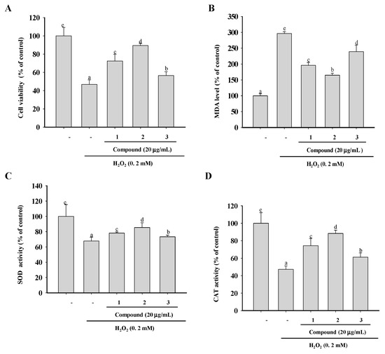 Cytoprotective activities of compounds 1–3. (A) RAW 264.7 macrophages were exposed to the test compounds for 0.5 h and then to 200 μM of H2O2 for 6 h. Cell viability was measured using the 1-(4,5-dimethylthiazol-2-yl)-3,5-diphenylformazan (MTT) assay. (B) The malondialdehyde (MDA) content and activities of the antioxidant enzymes superoxide dismutase (SOD) (C) and catalase (CAT) (D) were determined using commercial kits according to the manufacturers’ instructions. The data are presented as means ± SD (n = 3). Values with the same superscript letters are not significantly different from each other at p < 0.05.