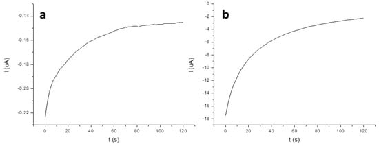 Chronoamperograms obtained for the deposition step of 5 µg L−1 Hg at 0 V for 120 s with (a) SGE and (b) AuNPs-GCE.