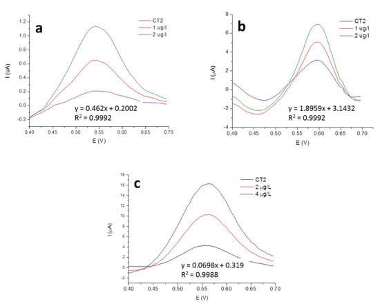 Figure 5 reports the voltammograms referred to the analysis of sample CT2 using SGE voltammogram (a) AuNPs-GCE (b) or AuNPs-GCE coupled to PT (c) with the two corresponding standard additions. The reported voltammograms were obtained after the subtraction of the correspondent blank signals. It is possible to observe that higher signals were recorded by AuNPs-GCE and then by SGE, even if the concentrations in the voltammetric cell are lower (the sample solutions were diluted with a different ratio in voltammetric cell, namely 1:10 in the case of SGE, and 1:20 in the case of AuNPs-GCE).