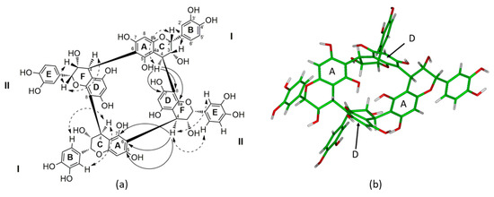 (a) Structure of the crown tetramer (1) with the key HMBC correlation (H→C, full arrow) and main ROESY correlation for the II units (dotted double arrow). Similar ROESY correlations were also observed for the I units. (b) 3D model of the crown procyadnidin tetramer (1) on the basis of NMR spectroscopic data and NMR restrained molecular modeling.