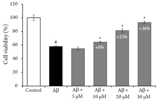 PC12 cells derived from rat pheochromocytoma were cultured in a DMEM-Glutamax medium containing 100 units/mL penicillin, 100 µg/mL streptomycin, 15% fetal horse serum, and 2.5% fetal bovine serum and maintained at 37 °C in a humidified incubator with 5% CO2. In 200 µL of culture medium, PC12 cells were sub-cultured at a density of 30,000 cells per well, in 96-well culture plates. After 24 h, cells were incubated with 4 µM of Aß25-35 in the absence or presence of different concentrations of crown tetramer (5, 10, 20, and 30 µM), in a serum-free culture medium. After treatment (24 h), PC12 cells were incubated with 0.5 mg/mL of MTT for 3 h at 37 °C. The dark blue formazan crystals formed in intact cells were solubilized with DMSO for 0.5 h. The absorbance was measured at 595 nm with a microplate reader (Dynex, Carnegie, PA, USA). Results were expressed as the percentage of MTT reduction in relation to the absorbance of control cells at 100%. All data represent the average of three tests. Data are shown as means ± SEM.