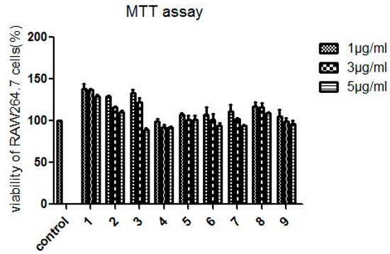 The viability of RAW264.7 cells in the presence of different concentrations of compounds (1, 3, 5 μg/mL, dissolved in DMSO) was evaluated by MTT assay. Briefly, the cells (1 × 105 cells/mL) were seeded into a 96-well plate. After 12 h incubation, compounds 1–9 with different concentrations were added into the wells and incubated for 24 h. Following incubation, the medium was removed, and 20 μL of MTT (5 mg/mL) was added into the wells and incubated for another 4 h. Finally, 150 μL of DMSO was added and the absorbance at 490 nm was determined using a microplate reader.