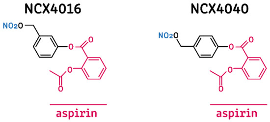 To date, the most studied NO-NSAIDs are those derived from aspirin (NO-aspirins), namely NCX4060, NCX4040, and NCX4016, which possess an –ONO2 substituent covalently linked through a benzene mediator in the -ortho, -meta, or -para position (relative to the carboxylic group of aspirin), respectively (Figure 1) [20]. NCX4016 is reported to be effective in both in vivo and in vitro models of leukemia, ovarian cancer, and colon cancer [18,21,22,23,24], while NCX4040 has been evaluated in colon and pancreatic cancer models [25,26,27,28]. NCX4060 is the least studied of this group of compounds and has shown antiproliferative effects against prostate cancer and non-small-cell lung cancer (NSCLC) cells [19,29]. There is also evidence that NCX4060 can induce apoptosis in NSCLC by disrupting the EGFR-AKT pathway [29].