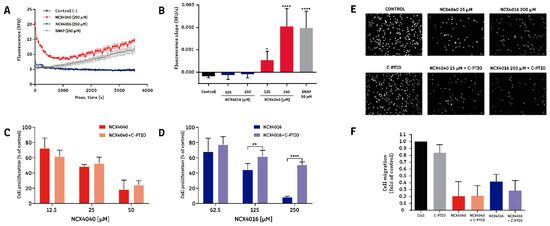 The relationship between nitric oxide (NO•) release by NO-aspirins and their effects on non-small-cell lung cancer (NSCLC) cells. Intracellular NO• release by NO-aspirins was measured using a DAF-2 fluorescent probe. H1299 cells were pre-loaded with DAF-2 prior to incubation in culture plates. After 24 h, cells were exposed to the different drugs. Cell viability was measured by MTT reduction. Cell migration was evaluated using an 8 µM-pore cell culture insert and fluorescence microscopy. (A) Representative graph showing the relative fluorescence induced by NO• release from NO-aspirins. (B) Slope of fluorescence over time, induced by NO• release from NO-aspirins. SNAP was used as a positive control for NO• release. * p < 0.05 and **** p < 0.00001, compared with the negative control, calculated by one-way ANOVA and Dunnett’s post-test. (C) Cell proliferation after exposure of H1299 cells to NCX4040 and NCX4040 + C-PTIO for 96 h. (D) Cell proliferation after exposure of H1299 cells to NCX4016 and NCX4016 + C-PTIO for 96 h. ** p < 0.01 and **** p < 0.00001, between the indicated groups, calculated by one-way ANOVA and Tukey post-test. (E) Representative images of H1299 cell migration following exposure to NO-aspirins alone or in the presence of C-PTIO. (F) Quantitation of migration of H1299 cells exposed to NO-aspirins alone and in the presence of C-PTIO. Bar graphs summarize the results of at least three independent experiments.