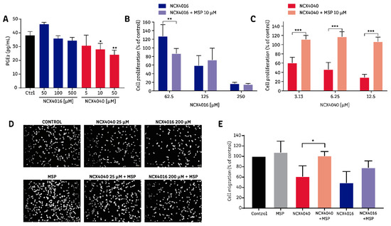 Relationship between the inhibition of prostaglandin E2 (PGE2) synthesis by NO-aspirins and their effects on non-small-cell lung cancer (NSCLC) cells. PGE2 levels were measured in H1299 cells exposed to NO-aspirins for 24 h. To evaluate cell viability, cells were exposed to NO-aspirins or NO-aspirins + misoprostol (MSP) for 96 h, then cell viability was measured by MTT reduction. Cell migration was evaluated after 6 h of exposure using an 8 μM-pore cell culture insert and fluorescence microscopy. (A) PGE2 levels in the supernatant of H1299 cells. * p < 0.05; ** p < 0.01, and *** p < 0.0001, compared with the control group, calculated by one-way ANOVA and Dunnett’s post-test. (B) Cell viability of H1299 exposed to NCX4016 or NCX4016 + MSP for 96 h. (C) Cell viability of H1299 cells exposed to NCX4040 or NCX4040 + MSP for 96 h. (D) Representative images of H1299 cell migration following exposure to NO-aspirins alone or in the presence of MSP. (E) Quantitation of the migration of H1299 cells exposed to NO-aspirins alone and in the presence of MSP. Bar graphs summarize the results of at least three independent experiments. For panels (B), (C), and (E), * p < 0.05; ** p < 0.01, and *** p < 0.0001, between the indicated groups, calculated by one-way ANOVA and Tukey post-test.