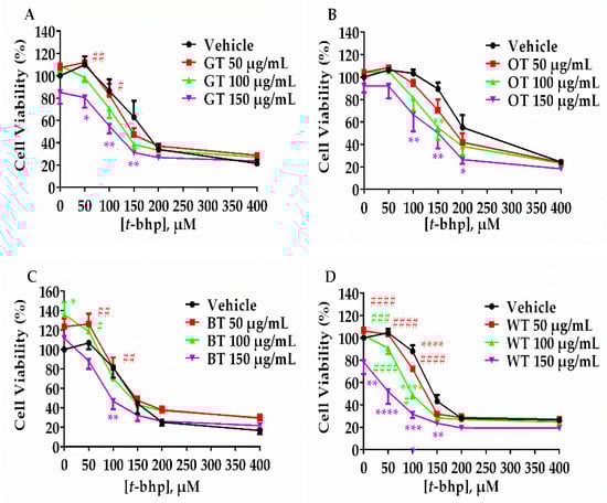 MTT assay of cell viability in response to 24 h incubation with t-bhp (0–400 µM), alone or in the presence of (A) GT, (B) OT, (C) BT and (D) WT extracts (50, 100 or 150 μg/mL). * p < 0.05, ** p < 0.01, *** p < 0.001, **** p < 0.0001 vs. vehicle. # p < 0.05, ## p < 0.01, ### p < 0.001, #### p < 0.0001 vs. 150 μg/mL. Results were expressed as mean ± standard deviation (n = 4).