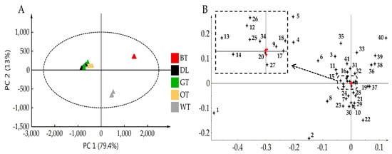 PCA of different tea types. (A) Score plot of PCA demonstrating differences in metabolite profiles between leaf samples based on 381 filtered single molecular features detected by UPLC-QTOF-MS in ESI−. (B) Loading plot of PCA indicating primary differential metabolites. Experiments were performed in triplicates.