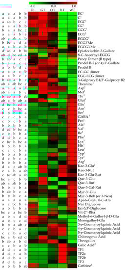 Comparisons of metabolite intensity in different tea types. Normalized values from three biological replicates were shown on a color scale proportional to the content of each metabolite and are expressed as log2. Lowercase letters on the left indicate significant differences (p < 0.05) among different samples. Compound name on the right with superscript 1 means they were detected by UPLC-QqQ-MS and superscript 2 means they were confirmed by authentic standards detected by UPLC-QTOF-MS. Others were identified through MS/MS information from UPLC-QTOF-MS.