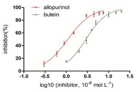 Inhibitory effect of butein on xanthine oxidase (XO) activity (pH = 7.5, T = 298 K). The final concentrations of xanthine and XO were 300 × 10−6 mol L−1 and 0.024 U mL−1, respectively. Each value represents means (±) standard deviation (n = 3).
