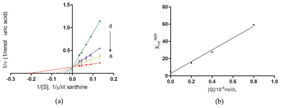 The assay was investigated applying the XO activity assay methodology in the absence and presence of butein with a series of concentrations of substrate xanthine (25, 37.5, 50, 75, and 100 × 10−6 mol L−1), where butein was at diverse concentrations (0, 0.2, 0.4, 0.8 × 10−6 mol L−1) and xanthine at a fixed concentration. The involved inhibition mode of the butein on xanthine oxidase was analyzed from Lineweaver–Burk plots, and Ki value was identified by the software GraphPad Prism 5.0 (GraphPad Software Inc., La Jolla, CA, USA). For competitive inhibition, the Lineweaver–Burk equation can be written in double reciprocal form as follows: