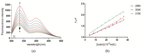 Fluorescence spectroscopy analysis was further used to research the binding properties of butein with XO on account of its ability to provide information on the molecular level of the binding mode, binding constant, and intermolecular distance. As shown in Figure 4a, under 280 nm excitation wavelength, the fluorescence emission spectra of XO inhibited by different concentrations of butein were excited. XO displayed two strong fluorescence emissions at 340 nm and 405 nm wavelengths due to the presence of three intrinsic fluorophores on XO, including tryptophan, tyrosine, and phenylalanine [30]. Nevertheless, butein has no intrinsic fluorescence under the same experiment conditions. Besides, fluorescence intensity of XO is mainly attributed to tryptophan residues due to the low quantum yield of phenylalanine. The results showed that XO emission intensities decreased dramatically with increasing of butein concentrations, which indicated that butein directly interacted with XO and quenched its intrinsic fluorescence.