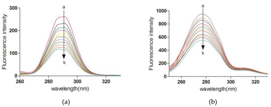 Synchronous fluorescence spectra of XO in the absence and presence of butein c(XO) = 0.1 U mL−1, and c(butein) = 0, 3.96, 7.84, 11.65, 15.39, 19.05, 22.64, 26.17, 29.63, 33.03, 36.36 × 10−6 mol L−1 for curves a → k, respectively. (a) ∆λ = 15 nm; (b) ∆λ = 60 nm.